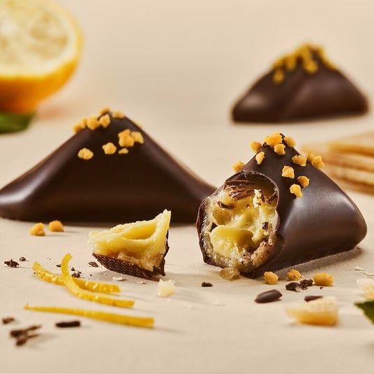 サクサクのヌガティーヌにエキゾチックなガナッシュを詰め、ダークチョコレートで包みました。ガナッシュは甘くジューシーなマンゴー、レモンのようなコリアンダー、繊細なユズがホワイトチョコレートに溶け込んでいます。一口食べれば、太陽が降り注ぐ夏の日が思い浮かぶカプリスです。