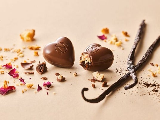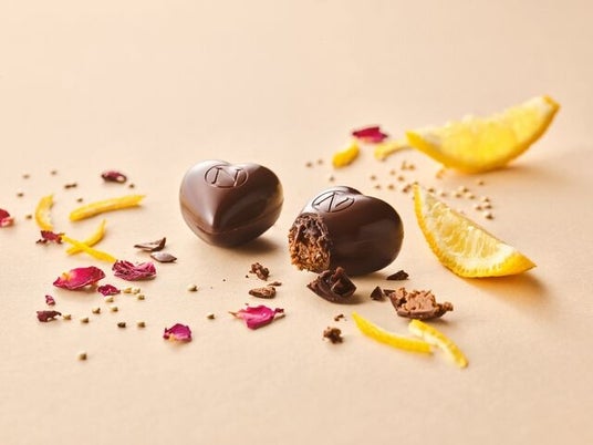 ダークチョコレートのハートの中には、ローズフレイバーのジャンドゥーヤと、フレッシュなユズとキヌアのさわやかな香りが詰まっています。