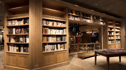 海外の博物館や図書館をイメージした大きな本棚に囲まれたスペースに、世界中から洋服