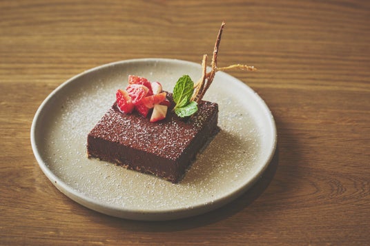 メニュー説明:イチゴ風味の日本酒がほんのりと香る、上品な生チョコタルト。ビターなチョコに素揚げしたゴボウの風味がマッチし、甘いけれど大人な味わい。