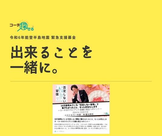 「コーチを探せる」は1月4日、ビジネスコーチ、ベストセラー作家の林健太郎さんを迎えて「10万部売れている「否定しない習慣」で書きたかったこと、もっとお伝えします ~コーチがクライアント支援に役立つポイント~」をテーマにオンラインでのトークライブ開催レポートを発表します。