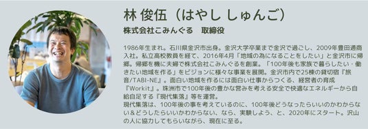 株式会社こみんぐるは、代表取締役の林佳奈と取締役の林俊伍が「地元・金沢に戻って地域のためになることがしたい」という想いから2016年に夫婦で創業。「100年後も家族で暮らしたい・働きたい地域を作る」をビジョンに掲げ、金沢市内で20棟の貸切宿『旅音/TABI-NE』。面白い地域を作るには面白い仕事からつくる、経営者の育成『Workit』。珠洲市で100年後の豊かな営みを考える安全で快適なエネルギーから自給自足する『現代集落』等を運営しています。