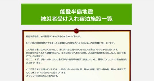「能登半島地震被災者受け入れ宿泊施設一覧」サイト