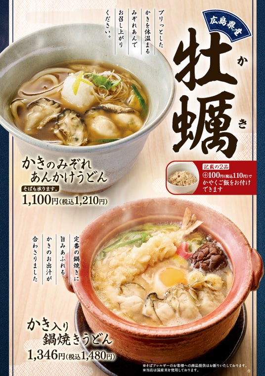 プリプリの牡蠣をみぞれあんかけで楽しむ「かきのみぞれあんかけうどん」と定番の鍋焼きうどんに牡蠣の旨味が合わさった「かき入り鍋焼きうどん」をお召し上がりください。