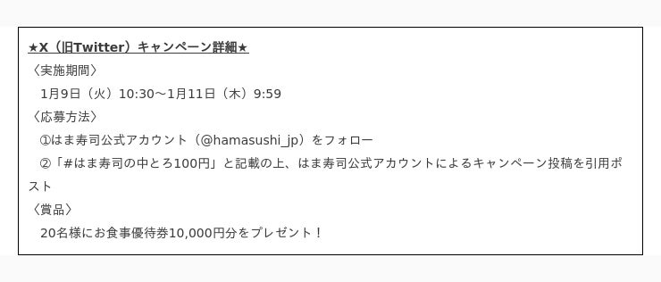 X(旧Twitter)はま寿司公式アカウントでは、フェア開催を記念し、抽選で20名様に10,000円分のお食事優待券が当たるキャンペーンを実施します。ふるってご参加ください!