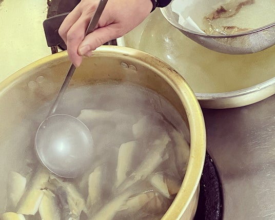 高級魚の鮎でとった出汁は、川釣りが盛んな湯沢市でその昔、淡水魚の漁をして生活する「川漁師(かわし)」が自分たちのために作っていた料理ですが、レシピ自体はあまりなく、今回当社では昔からの「口伝」の調理方法で再現して商品化を行いました。