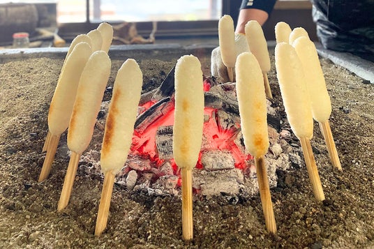 秋田の郷土料理きりたんぽには、当社の田んぼで育てた自家製「あきたこまち」を使用。土鍋で炊いた米から一本一本手作りしたきりたんぽを囲炉裏の炭火で丁寧に焼き上げました。