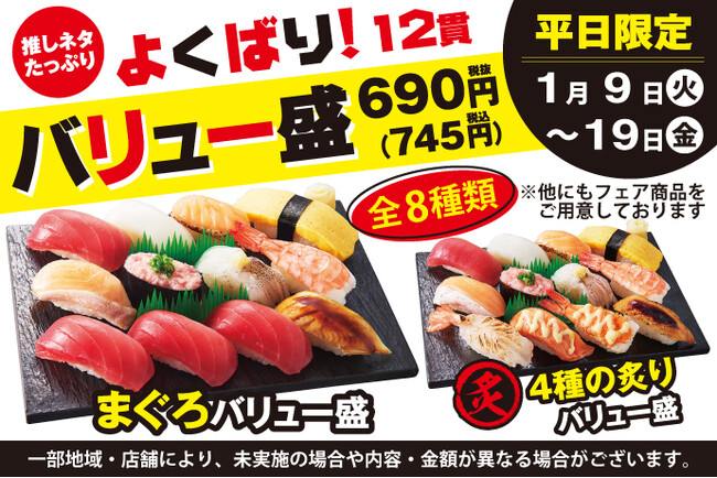 人気ネタが勢ぞろい!フェアでしか味わえない、炙りネタなども入ってバリエーション豊富な全8種類!平日特別価格『12貫690円(税込745円)』でご提供!!