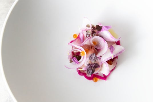 ブリの塩麹マリネ カラマタオリーブと白バルサミコのソース 紅しぐれ大根のサラダ