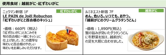 今回の企画は、2024年3月16日(土)の北陸新幹線 福井・敦賀開業で注目を集める福井県とのコラボレーション企画です。福井県には多くのブランド食材があります。今回は、越前がに・せいこがに・ふくいサーモン・敦賀真鯛・ふくい甘えびといったブランド水産物を中心に全7種の福井県産の食材を使用して、ルミネ新宿3館の18ショップが期間限定のメニューを21種類開発しています。日本海の豊かな漁場を有する福井県だからこそ美味しい福井の水産物を使った「福」をよぶ特別なメニューです。