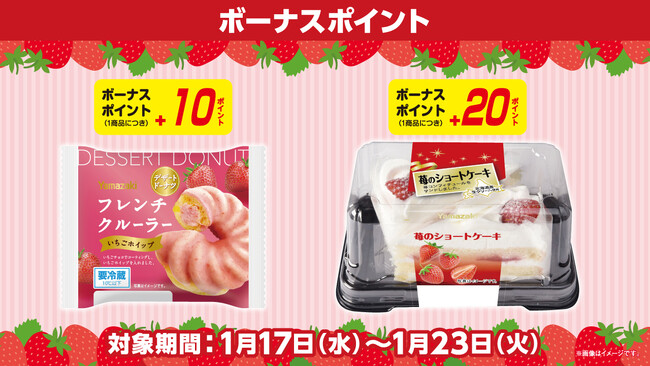対象商品:フレンチクルーラー(いちごホイップ)<10ポイント>/苺のショートケーキ<20ポイント>