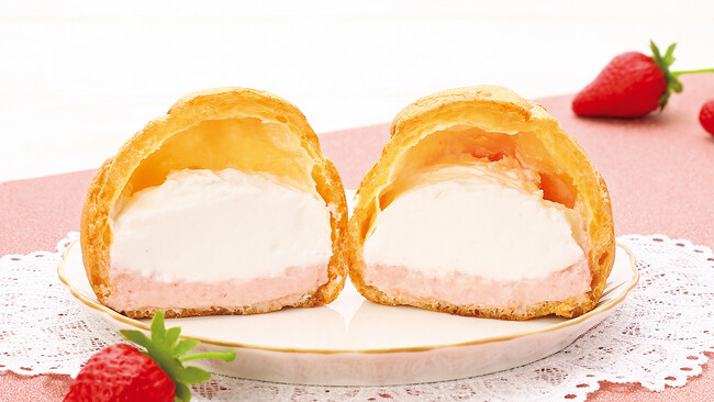 甘酸っぱい味わいのいちごクリームと、ホイップクリームが入ったツインシューです。いちごとホイップのハーモニーをお楽しみください。