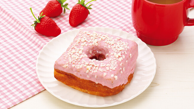 クロワッサンのようなサクッとした食感のドーナツにいちごクリームをサンドし、さらにいちごチョコをかけ、ホワイトクランチをトッピングして可愛らしく仕上げました。