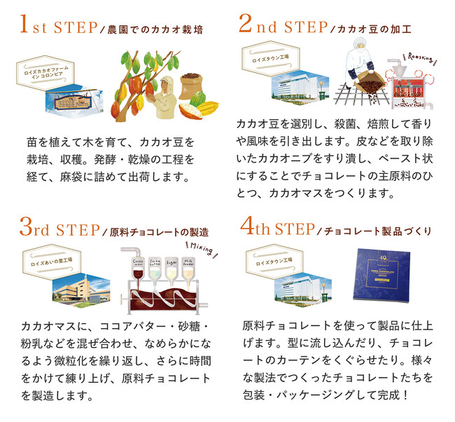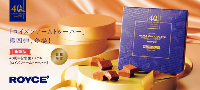 “チョコレートを、自分たちの手で育てたカカオ豆からつくりたい”。チョコレートメーカーとしての夢を叶えるべく、2014年に南米・コロンビアにカカオの自社農園を設立しました。創業40周年を迎えた2023年の夏には北海道・当別町のロイズタウン工場にカカオ豆加工プラントを新設し、自社農園で採れたカカオ豆を加工し製品にいたるまでのすべてを自社で一貫して手がける“ファームトゥーバー”のチョコレートが完成。長年夢見たロイズこだわりのチョコレートを、創業40周年記念の特別なパッケージでお届けしています。この“ファームトゥーバー”のチョコレート第四弾商品「40周年記念 生チョコレート[ロイズファームトゥーバー]」を2024年1月9日よりロイズ通信販売・ロイズ直営店にて期間・数量限定で販売開始しました。