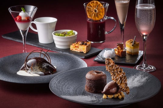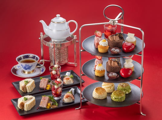 真っ赤なグラッサージュに包まれたルビーチョコやロールケーキなど、ショコラスイーツを華やかに織り交ぜたアフタヌーンティー。合鴨とオレンジのテリーヌや照り焼きチキンと玉子のパニーニなど、セイボリーもお楽しみいただけます。