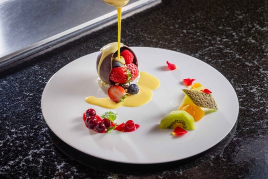 鉄板焼「那古亭」のデザートは、3種のベリーとフレッシュチーズを詰め込んだチョコレートに、パッションフルーツとマンゴーのソースをかけて。パリパリとろとろの食感や甘酸っぱい果実とのマリアージュに心奪われるひとときを。