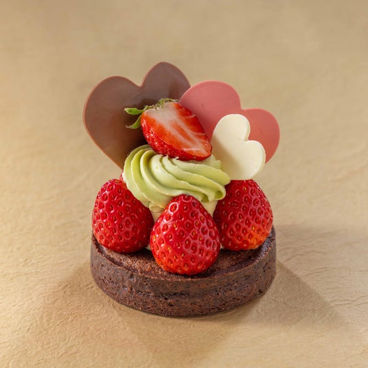 鮮やかな色合いで、酸味と甘みのバランスに優れる岐阜県産いちご「美濃娘」を使ったタルト。風味豊かに焼き上げたタルト生地に苺の甘酸っぱさ、カスタードとピスタチオのまろやかなクリームが織りなすバランスが珠玉のケーキ。
