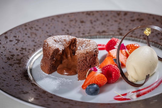 フランス料理「ミクニナゴヤ」のディナーコースのデザートに、あったかトロリとチョコレートソースがこぼれるフォンダンショコラが登場。