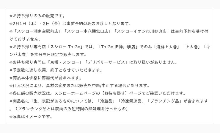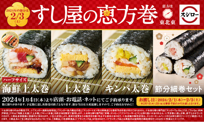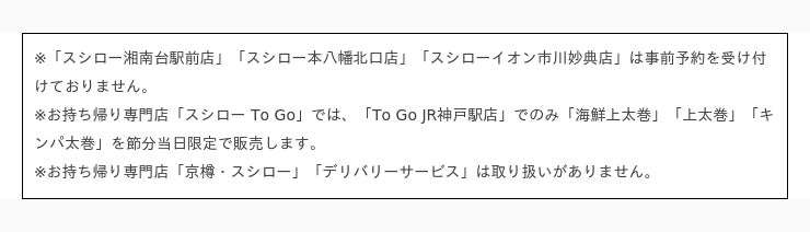※お持ち帰り専門店「スシロー To Go」では、「To Go JR神戸駅店」でのみ「海鮮上太巻」「上太巻」「キンパ太巻」を節分当日限定で販売します。