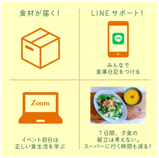 参加者には、1月20日(土)~1月26日(金) の7日間の夕食に召し上がっていただく、ワンプレートレシピが作れる食材をお届けします。また、本イベントの限定LINEオープンチャットでは、ヘルスコーチのAYUMIさんから食材を使ったレシピやヘルシーな献立のヒントを提供します。献立を考える悩みから解放され、食生活を見直すスペシャルな1週間をめざします。