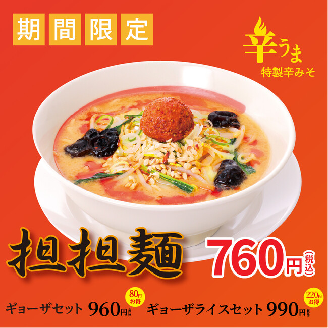 時間帯限定メニュー「ディナーセット」、「冷酒花春〈大吟醸〉セット」に、国産豚レバーの旨味を存分に味わえる「レバニラ炒め」を加えリニューアルいたします。また、期間限定で、白胡麻のコクと香りを楽しめる、程よい辛さの「担担麺」 760円(税込)を販売いたします。「担担麺」には、お得なギョーザセット960円(税込)、ギョーザライスセット990円(税込)もご用意いたしました。是非、ご賞味ください。