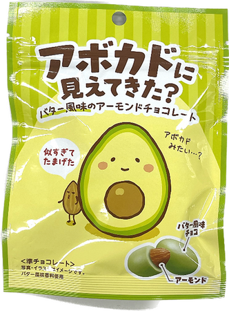 商品特徴:見た目をアボカドに見立てた商品。バター風味のチョコレートです。