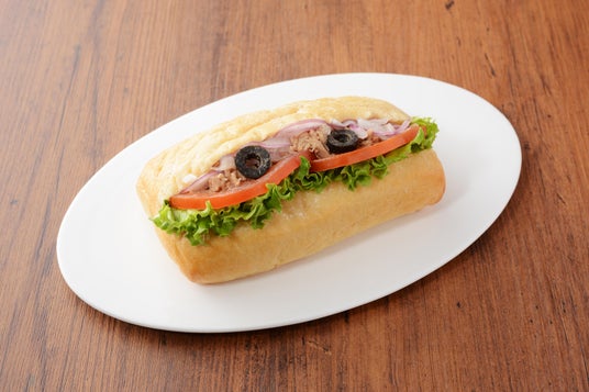 外は香ばしく中はしっかりめの食感のパンに、トマト、グリーンリーフ、レッドオニオン、ブラックペッパーをきかせたツナ、ブラックオリーブをはさんだ彩り鮮やかなチャバタです。