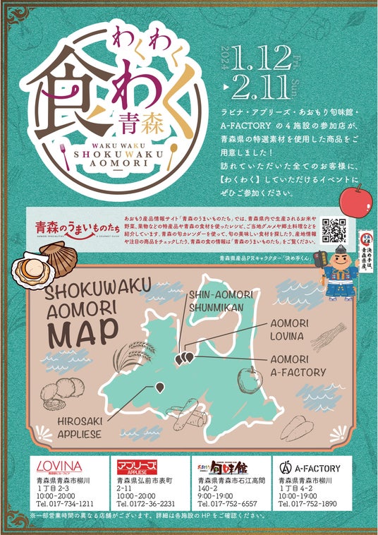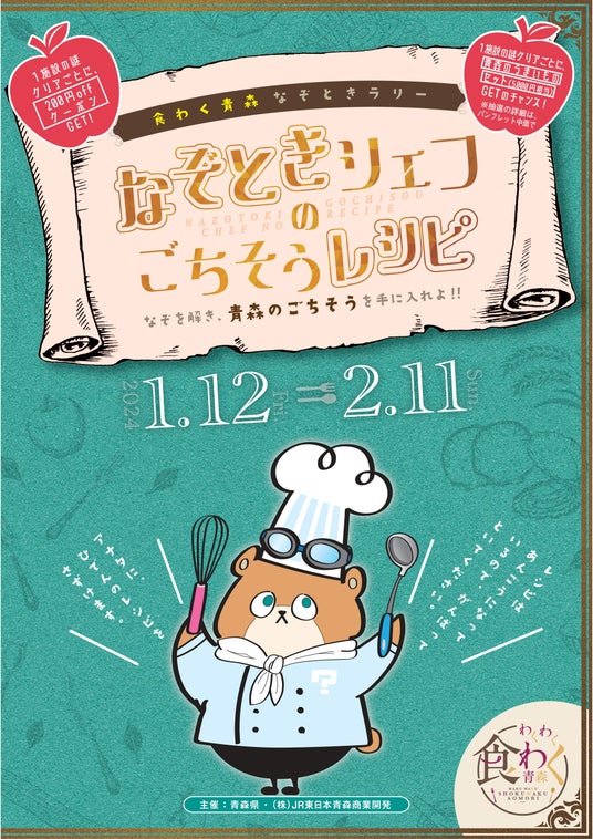株式会社JR東日本青森商業開発(本社:青森県青森市柳川一丁目2番3号、代表取締役社長:紺野洋紀)は、青森県と協力し、青森県産食材の魅力を発信するキャンペーン「食わく青森なぞときラリー」を、県内4施設(青森駅ビル・ラビナ、新青森駅ビル・あおもり旬味館、A-FACTORY、弘前駅ビル・アプリーズ)で2024年1月12日(金)から開催します。