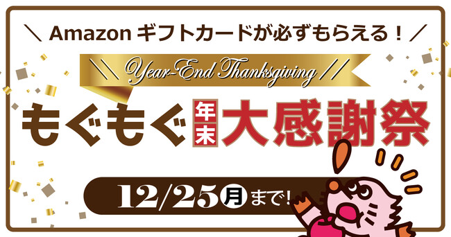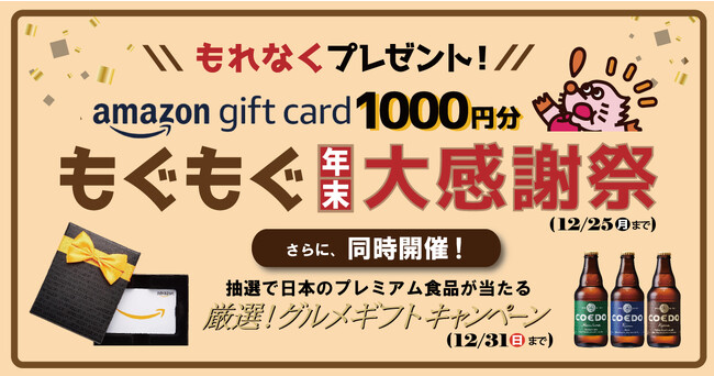 ふるさと納税サイト「もぐふる」は、1万円以上寄附いただいた方にもれなくAmazonギフトカード1,000円分をプレゼントする「年末大感謝祭」を12月25日(月)まで開催します。「もぐふる」オープン以来はじめて迎える年末を記念した特別企画です。