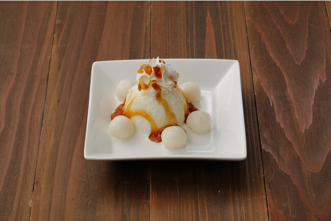 ヒラヤミルクアイスにみたらしのたれと生クリーム使用のホイップをトッピングし、あったかい白玉を添えた新感覚のデザート!