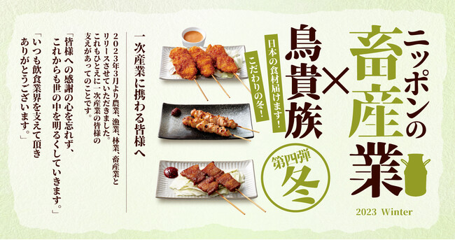 株式会社鳥貴族(本社:大阪市浪速区 代表取締役社長:江野澤暢男)が運営する全品328円均一(税込360円)の焼鳥屋「鳥貴族」は、2023年12月7日より、「日本の一次産業感謝!応援メニュー」の第四弾として「畜産業」にスポットを当てた期間限定メニューの提供を開始いたします。