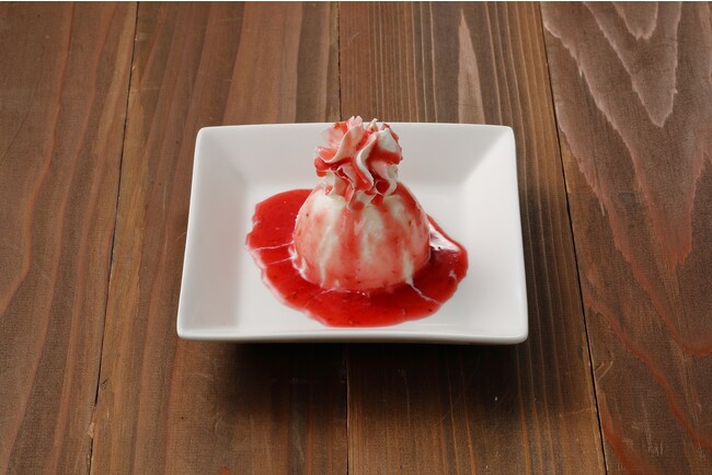 ヒラヤミルクアイスにとちおとめや紅ほっぺ等の厳選した国産苺シロップと生クリーム使用のホイップをトッピングした相性抜群のデザート。