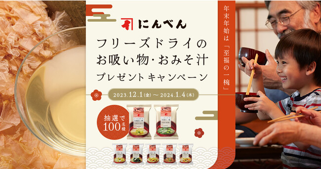 マイページ内のキャンペーンバナーより簡単なアンケートにお答えいただいた方の中から、抽選で100名様に鰹節専門店「にんべん」様ご提供、「至福の一椀 お吸い物・おみそ汁」5個セットをプレゼントいたします。