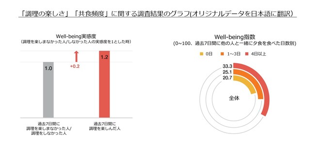 これらの質問への回答と、GWPで調査している主観的Well-beingとの関係性を分析した結果、過去7日間に「調理を楽しんだ人」は、「調理を楽しまなかった人」「調理をしなかった人」と比べてWell-beingを実感する可能性が統計的に有意に1.2倍高いこと、また、共食頻度が高くなるにつれて主観的Well-being指数が高くなることがわかり、調理を楽しんだり、他の人と一緒に頻繁に食事をしたりすることは、主観的Well-beingに貢献することが世界規模で明らかとなりました。