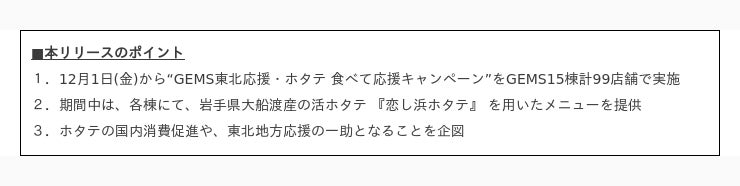 野村不動産コマース株式会社(本社:東京都新宿区/代表取締役社長:矢野 忠孝、以下当社)は、都市型商業施設「GEMS」15棟 計99店舗において、“GEMS東北応援・ホタテ 食べて応援キャンペーン”を2023年12月1日(金)から12月15日(金)の期間で開催することをお知らせいたします。
