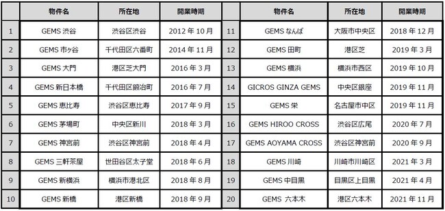 ※GEMSシリーズは野村不動産株式会社、野村不動産投資顧問株式会社が運用を受託する野村不動産マスターファンド投資法人及び野村不動産プライベート投資法人が所有し、野村不動産コマース株式会社が一括して施設運営を行っています。