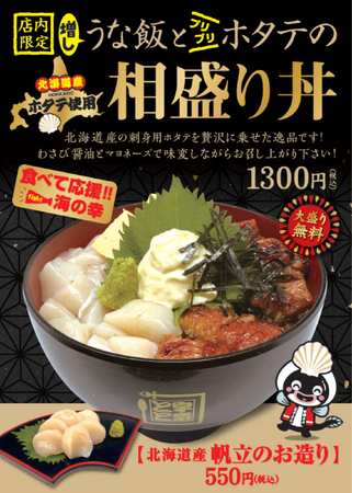 新メニューは、水産物の中でも特に深刻な打撃を受けた北海道産のぷりぷりホタテを使用した「うな飯増しとプリプリホタテの相盛り丼」です。