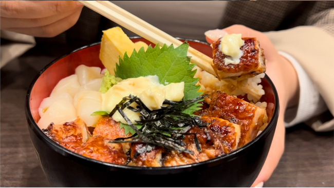1品で4回楽しめる「うな飯増しとプリプリホタテの相盛り丼」!