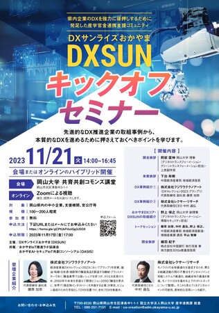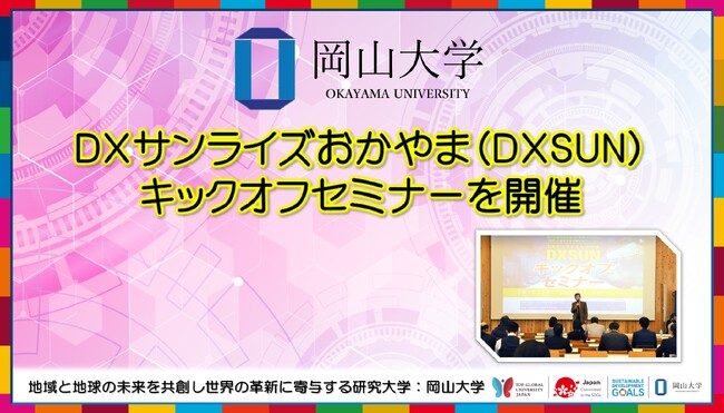 国立大学法人岡山大学(本部:岡山市北区、学長:那須保友)は2023年11月21日、産学官金が連携して中小企業のDXを強力に後押しするコミュニティ「DXサンライズおかやま」(以下、DXSUN)の本格的な活動開始を記念したキックオフセミナーを本学津島キャンパスの共育共創コモンズ(OUX)にて開催し、県内企業や支援機関関係者など約110人が参加しました。