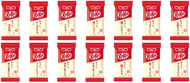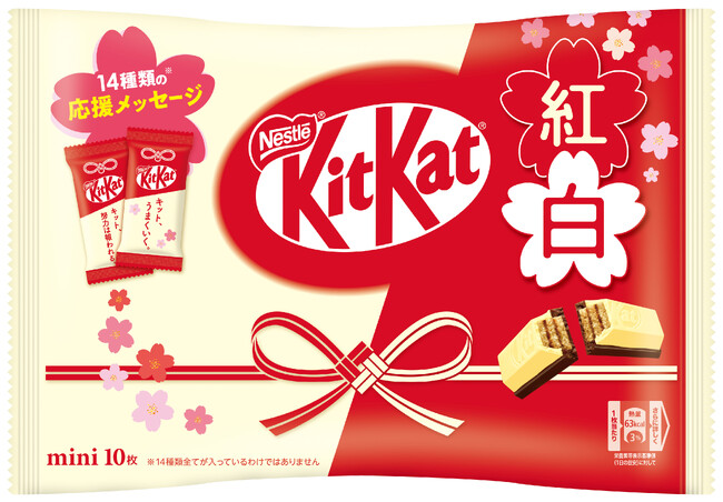 本製品は、定番の赤いパッケージの「ミルクチョコレート」と、「ホワイトチョコレート」の2つの味を1枚で楽しむことができる特別な「キットカット」です。外袋は、縁起が良い紅白カラーに、”願いが叶う”といういわれのある「叶結び」をデザインに取り入れています。また、中の個包装は14種類あり、それぞれ「キット、大丈夫!」などの応援メッセージが書かれており、受験生の応援は勿論、スポーツや恋愛、就職活動などの様々なシーンで、目標に向かって頑張る全ての人を応援するアイテムとしておすすめです。
