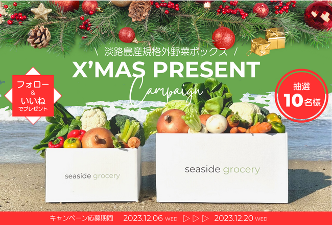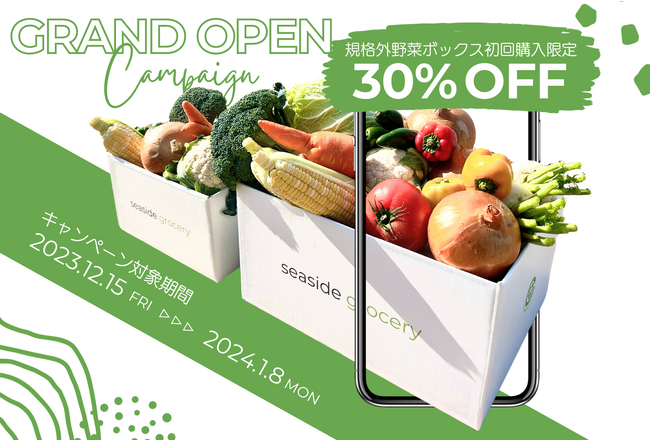 2023年10月13日(金)にプレオープンをいたしました株式会社seaside hub(兵庫県洲本市)が展開する淡路島産規格外野菜通販サイト、seaside grocery(シーサイドグロサリー)が、2023年12月15日(金)にグランドオープンいたします。プレオープンから約2か月を経て、規格外野菜ボックスのサイズも2サイズに増え、規格外野菜のサブスク(定期購入)もスタートしました。今回のグランドオープンを記念し2つのキャンペーンを実施いたします。