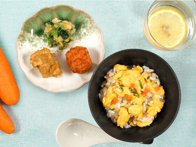 「ふーふー」温まりたい時期にぴったり!!大根、シイタケ、人参、青葱等のたっぷりの野菜を使用し、かつおだしとおろし生姜で仕上げたたまご雑炊です。たくさんの具材を味わえるプレートとなっております。