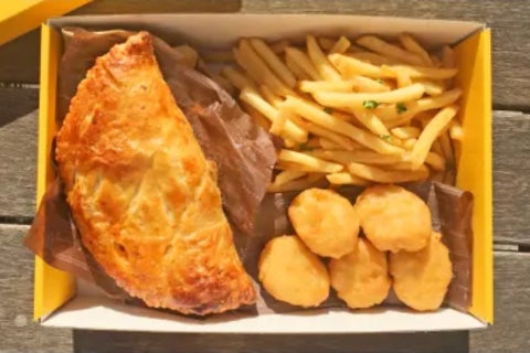 ハーフサイズのビーフミートパイとチキンナゲット、フライドポテトが入った、ご家庭で本格パイを味わえるボックス。