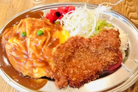 特製オムライスにチキンカツ、そして2種のサラダが添えられた、センターグリルを味わい尽くせる一皿です。