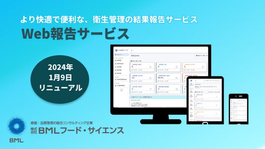 株式会社BMLフード・サイエンス(本社:東京都新宿区/代表取締役社長:小日向 清隆)は、食の安全・安心に関する社会的な要求やお客様のニーズに応えるべく、食品関連事業者向けの衛生管理の結果報告サービス「Web報告サービス」をリニューアルしました。このサービスでは、当社が提供する食品衛生検査の結果(食品検査、検便検査、厨房衛生点検、異物検査)の受付状況や結果をWeb上でリアルタイムに確認できるほか、報告書などの書類をダウンロードできるなど一元管理ができます。2024年1月9日より、従来に比べて新たな機能を追加し、リリースいたします。