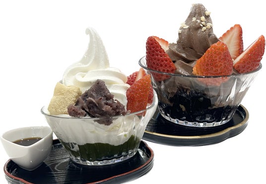 <魚沼食堂> 「苺のぱふぇ」各800円(イ)ー「とちあいか使用。「抹茶といちご」、「チョコといちご」の2種類のパフェ。
