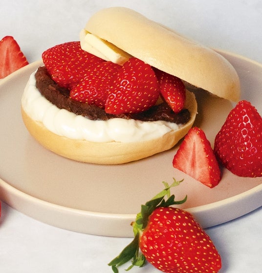 <ベーグル&ベーグル>「とちおとめとあずき豆乳クリーム」 628円(テ)640円(イ)ー甘酸っぱい「とちおとめ」とあんことまろやかな豆乳クリームのベーグルスイーツサンド。(1日10食限定)