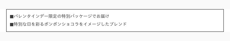 特別な日のチョコレートにふさわしいボンボンショコラをイメージし、周りを覆うチョコレートと中のガナッシュの心地よいハーモーニーや味わいの奥行き・複雑さを表現した味わいのバレンタインシーズン限定「ショコラブレンド(深煎り)」をご用意しました。クラシックショコラ、アーモンドの風味やなめらかな口当たりが楽しめます。コーヒー豆のほか、お湯を注ぐだけで手軽に楽しめるドリップバッグもご用意。日頃お世話になっている方への贈物や自分へのご褒美に、大切な人に感謝の気持ちを伝えるバレンタインのプレゼントにおすすめです。