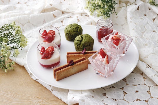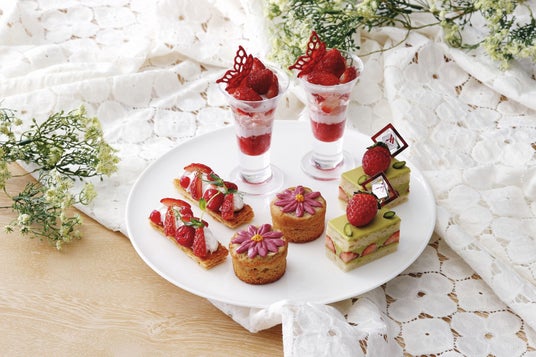 この春にご提供する「Vegan Afternoon Tea -Spring -」では、うららかな春に花が咲き誇るガーデンをイメージしたスイーツ8種・セイボリー4種をご用意しました。スイーツではいちご畑に止まる蝶をイメージしたかわいらしいミニパフェや、パティシエ自らヴィーガンバターや小麦粉などの原料をバランスよく配合させしっとりと焼き上げた自慢のスコーンなど、素材の選定から製法までこだわり抜いた8品がラインアップ。セイボリーは、野菜のだしが効いたレッドカラーが目を惹くポタージュスープやヴィーガンツナのスティックサンドなどが並び、華やかなヴィーガンメニューをご堪能いただけます。
