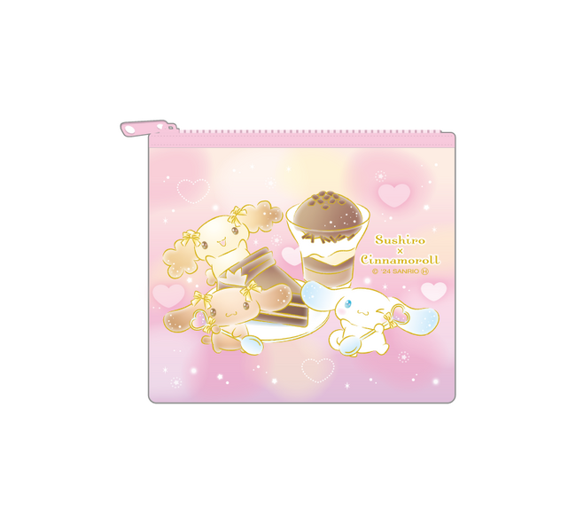 「ぷちローセット」をご注文いただいた方にランダムで、「シナモロール」コラボ限定の描き下ろしビジュアルのオリジナルファスナーポーチが付いてきます。どのデザインになるかは届いてからのお楽しみです。
